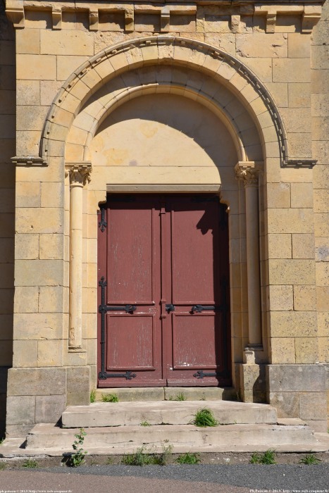 - La Porte est située sous trois bandeaux cintrés décorés, l’un de rosaces, un autre d’une moulure câblée, le troisième de bâtons rompu, une archivolte à losanges encadre le tout.