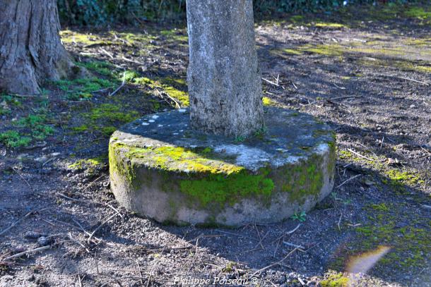 - La croix en fer forgé est plantée dans un fut en pierre octogonal. Ce fut est fixé sur une pierre ronde, une meule semble-t-il ; l’autre meule repose à quelques mètres vers l’est de cet emplacement. S’agit-il des vestiges de la ferme du Puits de l’Ane ?.