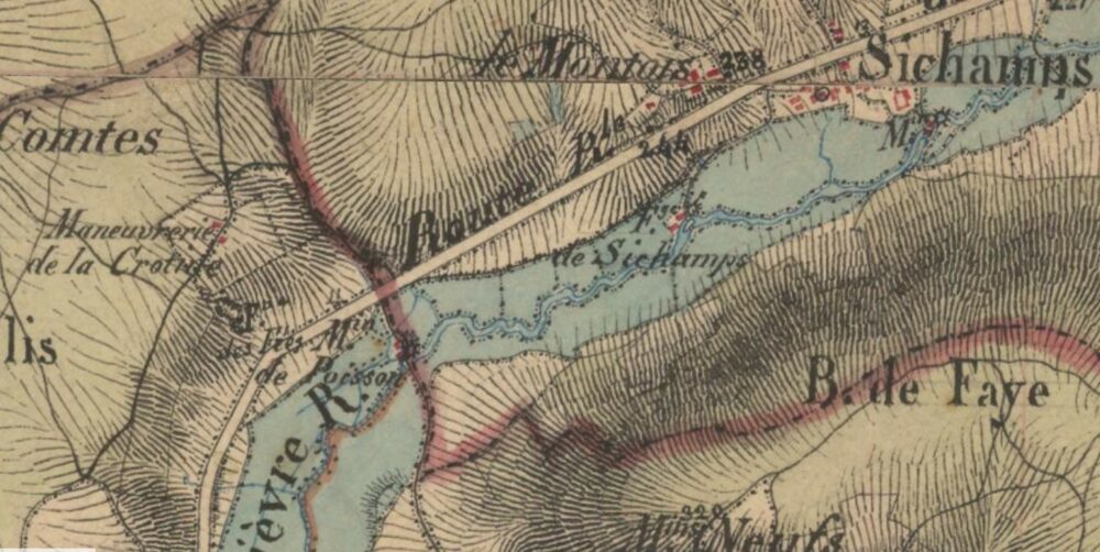 • « Dans le redan de deux collines… on voit saillir un bloc de calcaire sous lequel s’ouvre une grotte redoutée de tout le voisinage ; là jaillit la Fontaine des Fées, dont les eaux se perdent avec bruit dans les cavités souterraines auprès de la source, et reparaissent un demi-quart de lieue plus loin, pures et limpides, dans les prés du moulin de Poisson.