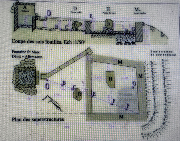 - Un monolithe de granit cubique pratiquement rectangulaire, en équilibre sur trois pierres pointues noyées dans le remblai, dans le petit bassin situé devant la fontaine Saint-Marc. Antérieur à la mise en place du tumulus de pierres de la fontaine.