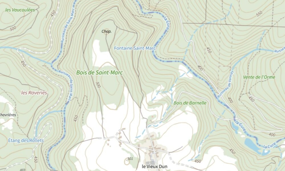 - Pour y accéder, suivre le chemin de terre (ruisselant) sur environ 700 mètres. Au pied d’une vaste clairière dominant la confluence Cure/Saint-Marc. Une implantation, sur un éperon protégé entre deux vallées, qui est à l’origine du village.