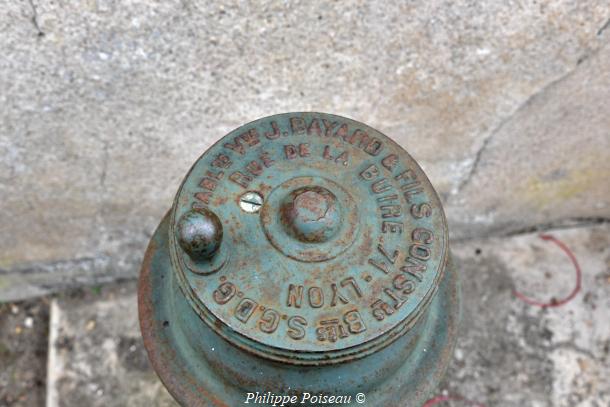 • Cette pompe de Dampierre-sous-Bouhy est située le long de la départementale 957, placée dans le cimetière auprès de la porte d’entrée. Elle mesure environ 95 cm de hauteur. Une pompe en fonte moulée. Sur le bas du corps de pompe il est noté dans un losange « Bayard ». Sur le dessus Etablissement Veuve J.Bayard et fils – Construction B.t.e.s – S.G.D.G rue de la Buire – 71 – Lyon.
