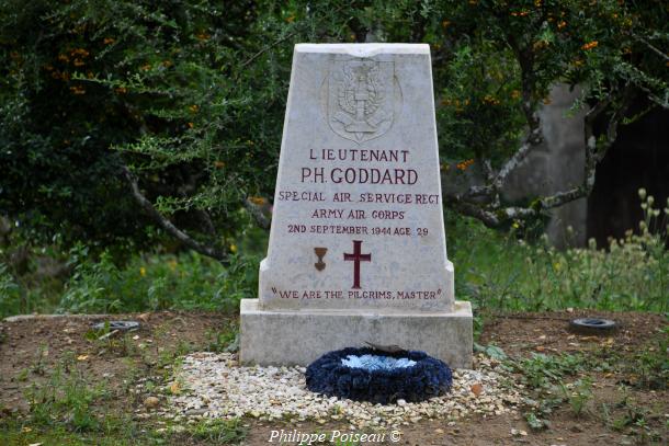 - Cette stèle en pierre est située aux abord du lavoir, au croisement de la départementale 23 et de la rue de Champmoreau. Sur celle-ci, il est inscrit : »Lieutenant P.H GODDARD Spécial Air Service RGT Army Air Corps 2ND September 1944 Age 29. We Are The Pilcrims, Master » traduit par Nous sommes le maître des pèlerins.
