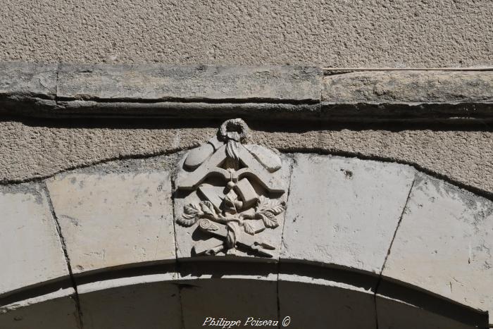 Sur les écussons situés sur les clefs du haut des fenêtres de la façade, nous pouvons observer, sculpter dans de la pierre calcaire de Bourgogne, une équerre, un compas, un fil à plomb et un maillet entre deux semelles de chaussures.
