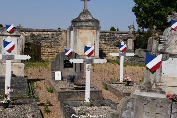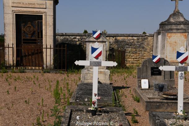 - Les noms des soldats sur les tombes : E.COGNET – R.JUCLART (photos portrait) – SIMON.PIERRE (photos portrait)- E.G.MEUNIER – LOUIS.ROUMIER (mort en captivité) – M.BERNARD (46éme R.I) – POUMY.CHARLES – A.PETIT – N.REVIER – A.PIFFAULT – E.SIMONT – JOSEPH.VIN – F.DERRIER – FRELAT.GEORGES – JEAN.LOUIS.MAISON – ALFRED.VALLET – ARMAN.THIERRY 1945 – JOSEPH VERNHES 14-18. D’autres tombes portent un drapeau mais non plus de noms.
