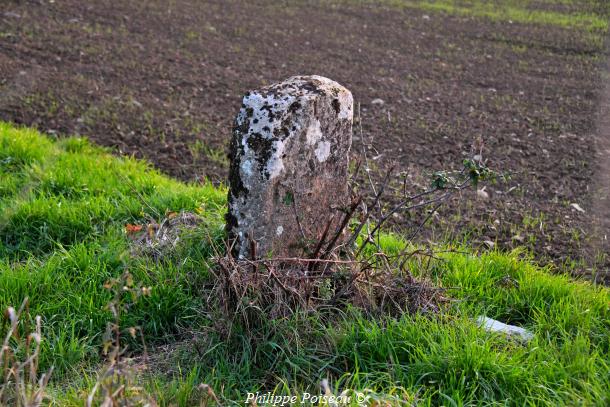 - Une pierre taillée de la main de l’homme, abîmée par le temps et par les machines agricoles. Cette pierre devait être bien plus haute.