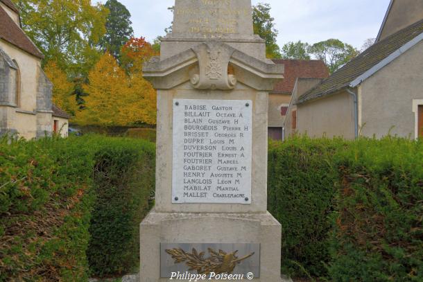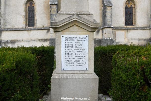 1914-1918 – 1939-1945″. - Les morts : BABISE GASTON – BILLAULT OCTAVE A – BLAIN GUSTAVE H – BOURGEOIS PIERRE H – BRISSET GEORGES R – DUPRÉ LOUIS M – DUVERSON LOUIS A – FOUTRIER ERNEST A – FOUTRIER MARCEL – GABORET GUSTAVE M – HENRY AUGUSTE M – LANGLOIS LEON M – MABILAT MARTIAL – MALLET CHARLEMAGNE – MARTIGNON GASTON – MERCIER RAYMOND G – PETIOT MOISE E – PRÈTRE GÉRARD – PRÈTRE MICHEL – RAVET APPOLINAIRE – REDOUTÉ HONORÉ H – ROBLIN OCTAVE A – ROLLET GEORGES A – ROUSSEAU MOISE A – TARIN JULIEN M – VILLOIS MARTIAL A – VILLOIS JOSEPH G – RAMEAU ANDRÉ – COUSON GASTON – MARQUET EUGÈNE – BONARD OCTAVE – LEGENDRE MARCEL – AUGERY GASTON – FÊVRE OCTAVE – PATIN PAUL CDT – ESPITALIER MAX LT – CORDE ANDRÉ – CHARNIN EUGÈNE.