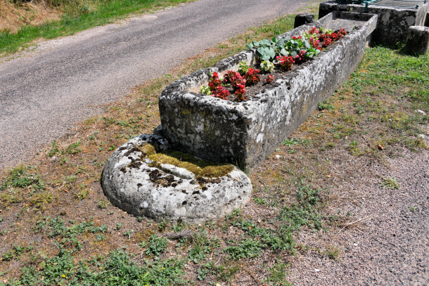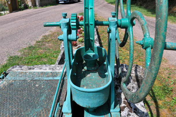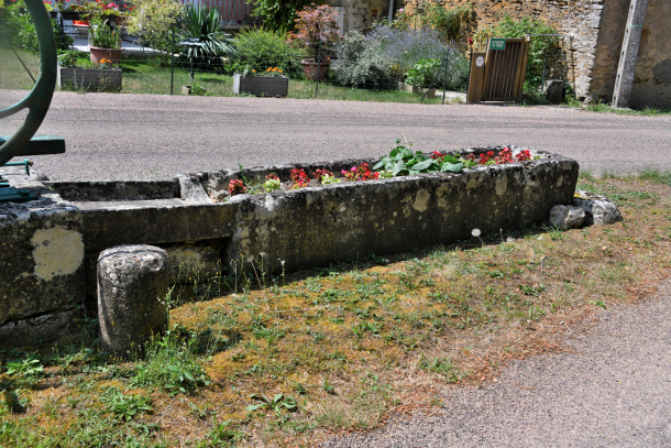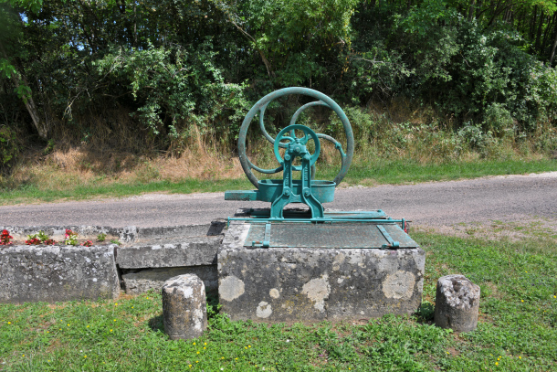 - Le puits est remplacé par une pompe à volant Sauzey-Frère d’Autin. Celui-ci est protégé par quatre bornes. L’eau se déverse dans l’évier en pierre de plan rectangulaire permettant le lavage du linge. Puis l’eau sécoule dans une grande auge taillée dans une pierre.