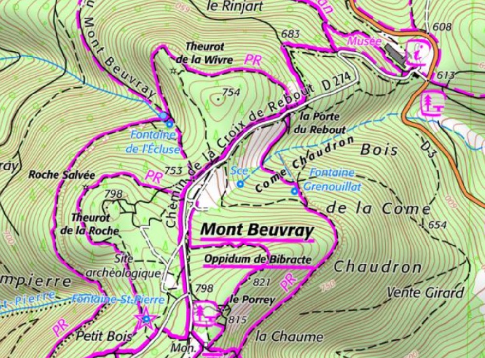 • Le Theurot de la Wivre (Theureau) est situé dans la partie nord-ouest des remparts. Des roches visibles sur le sommet du site sont à observer. Situé à l’Est du chemin du Mont Beuvray.