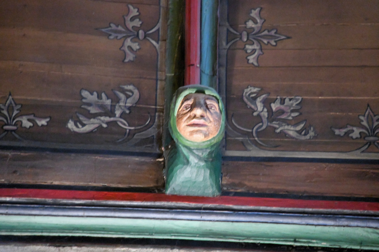 - La voute en berceau brisé, avec sa charpente lambrissée est vraiment remarquable. Une belle carène de bateau, les entraits sont peints et leurs extrémités sont ornées de têtes de monstres.