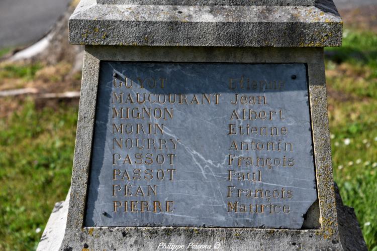 - 1939-1945 : ALEXANDRE Ernest ARRIAT Hubert BRIDET Henri CAILLOT Louis CHICOUARD Gaston JEANNET Louis – Sur le socle Marbrerie funéraire Piroux-Douarne 58700 Prémery.