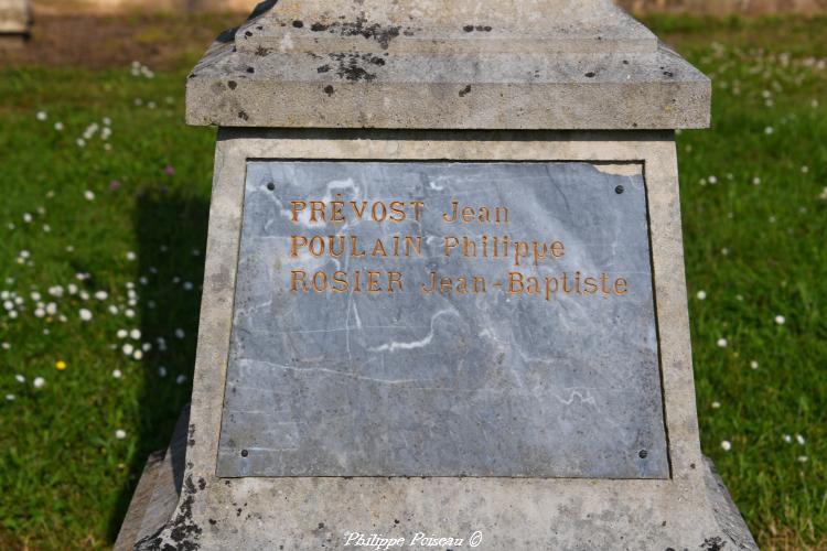 - 1914 – 1918 (sur les quatre faces des plaques de marbres portent les noms )ALEXANDRE Auguste BALANGER Alexis BALANGER Pierre BOBIN Philippe CAILLOT Victor CHAGNY Louis DARMAGNAC Gabriel DOISNEAU Ernest GRÉGOIRE François GUYOT Étienne MAUCOURANT Jean MUGNON Albert MORIN Étienne NOURRY Antonin PASSOT François PASSOT Paul PÉAN François PIERRE Maurice PIEUCHOT François PEUBRIER Lucien SAMSON Pierre SIMON Antoine SIROT Paul THÉVENARD Louis Gabriel THIERRY Louis VELU Léon ZORN Maurice ROSIER Jean-Baptiste PREVOST Jean POULAIN Philippe . Une autre plaque porte les noms: » CORBIER Jean – MANIQUAIRE François « . Une autre plaque: » LES POILUS DE St AUBIN A LEURS CAMARADES 11-11 19273″ .