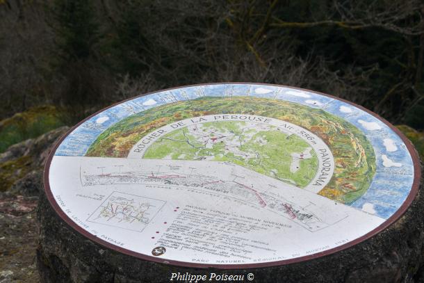 - Le Panorama de la Pérouse est installée en 1978 sur la commune de Quarré-les-Tombes dans l’Yonne, sur le point culminant à 556 mètres du département, un petit sommet, une belle table circulaire illustre le paysage du Morvan central. Visité lors d’une de mes recherches de panoramas de documents et de pierres de toutes sortes dans le Nivernais: « Chaos Granitique, Pierres de légendes, monolithes, mégalithes, Dolmen, Menhirs, rochers etc. ».