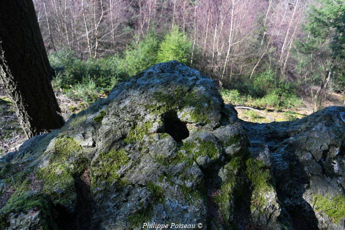 - La vallée du ruisseau de Malvaux est visible depuis cet endroit. Un bloc de granit avec un orifice presque circulaire, probablement percé par l’homme, se trouve sur la partie la plus élevée de la roche. Nous pouvons aussi observer une forme ressemblant à une empreinte d’équidés, en dessous légèrement à gauche.