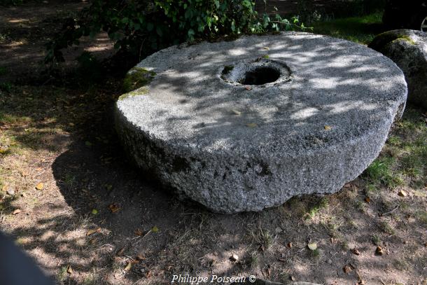 - Un des anciens moulins à huile du Nivernais. Nous pouvons nous en faire une idée grâce à d’anciennes cartes postales. Cette meule a été récupérée en contrebas de son emplacement actuel. On peut imaginer sa position initiale, visible par quelques ruines de ses fondations et de son couloir de passage des eaux.