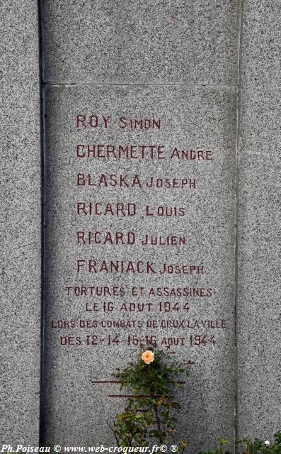 - Ce Monument des victimes de Guerre de Crux la Ville est édifié en mémoire des civils victimes de la barbarie nazie. ROY SIMON – CHERMETTE ANDRE – BLASKA JOSEPH – RICARD LOUIS – RICARD JULIEN – FRANIACK JOSEPH – Torturé et assassinés le 16 Aout 1944 lors des combats de Crux la Ville les 12 – 13 – 14 – 15- 16 AOUT 1944. SELLIER MAURICE tué à l’ennemie le 20 mai 1940. FEVRE EMILE MORT EN CAPTIVITE le 17 novembre 1940. CHAUSSEMY Louis mort en captivité. VERDEZ tué à la résistance.
